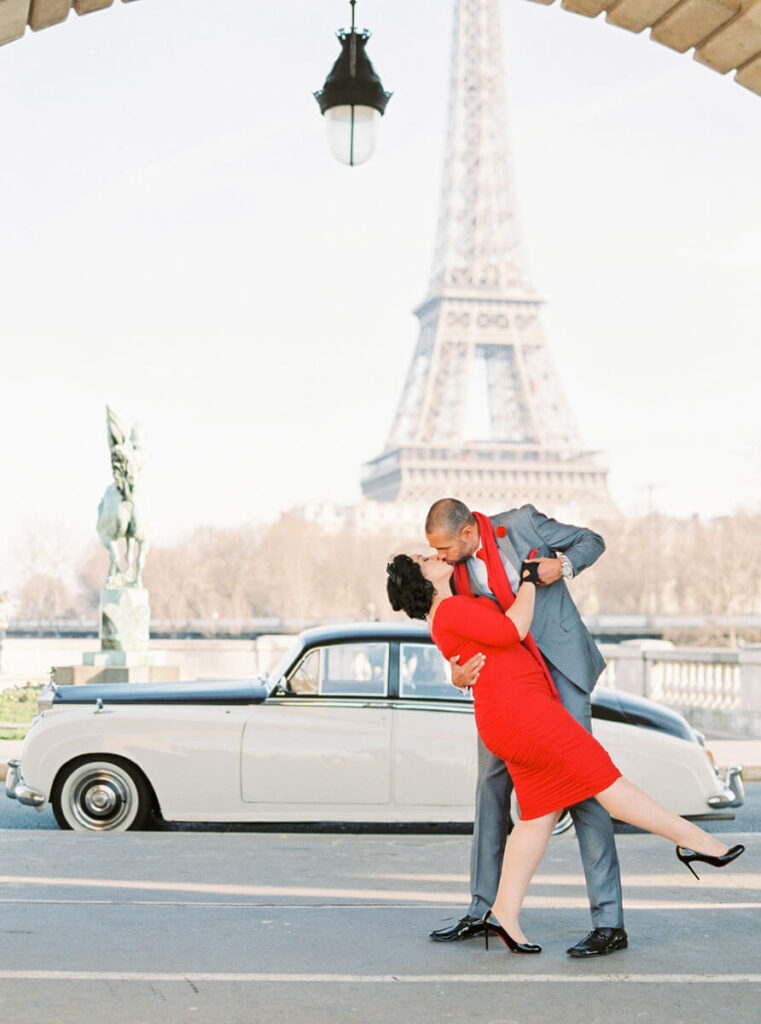 Beautiful details for this lovely couple’s romantic Paris photo shoot – a vintage Rolls Royce, a kiss under the mistletoe, and Christian Louboutin heels. Locations included La Seine, The Eiffel Tower and Place Colette. Shot entirely on medium format film.