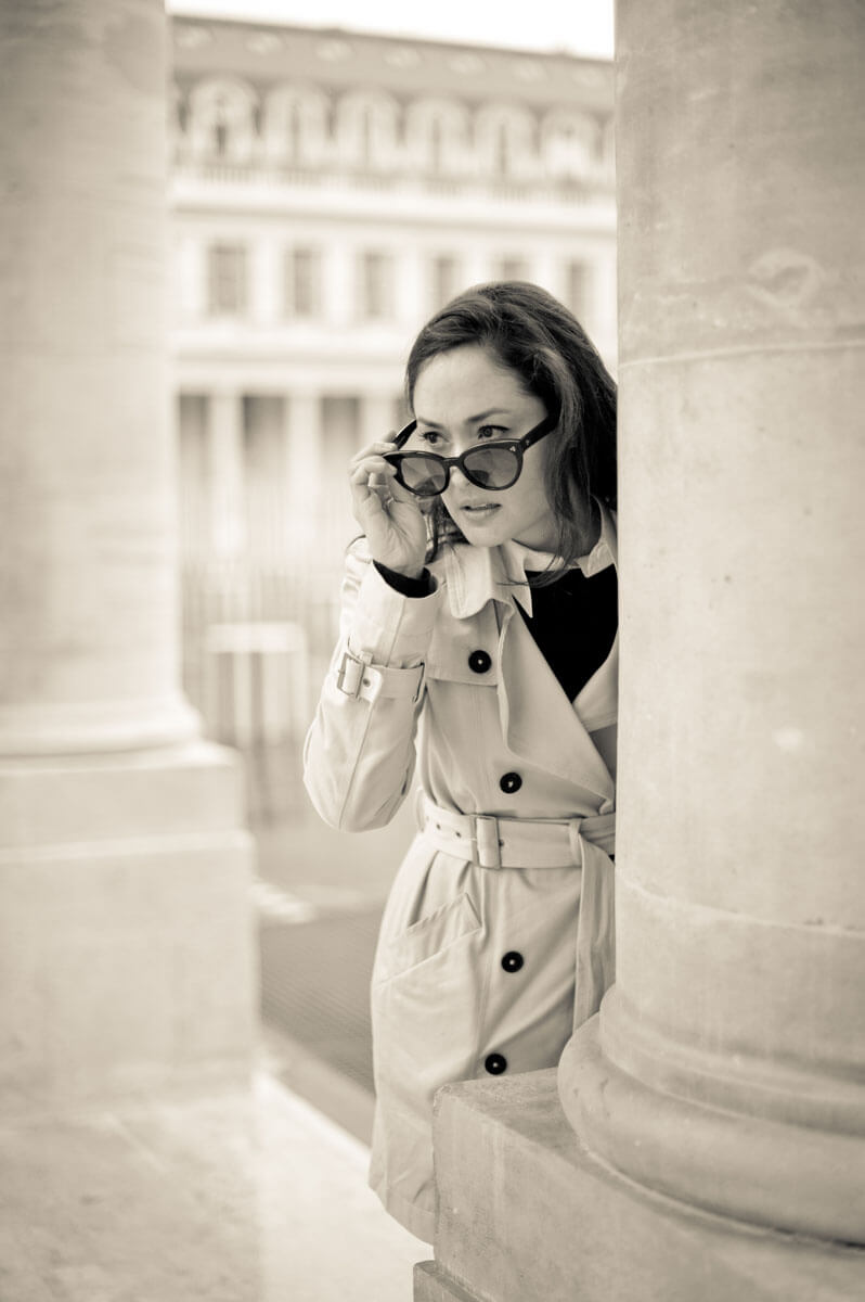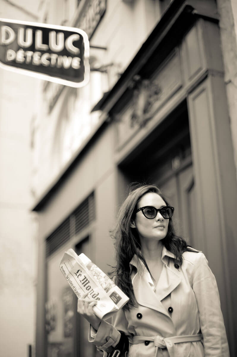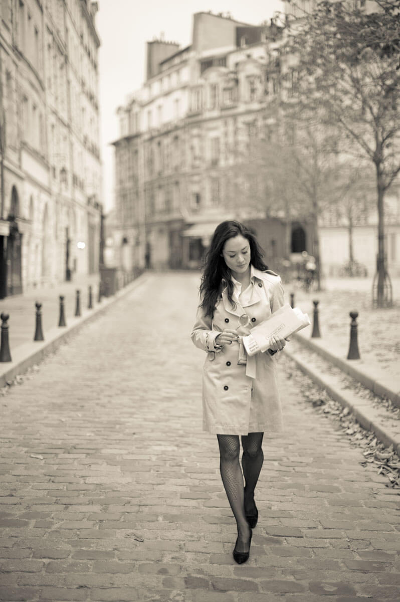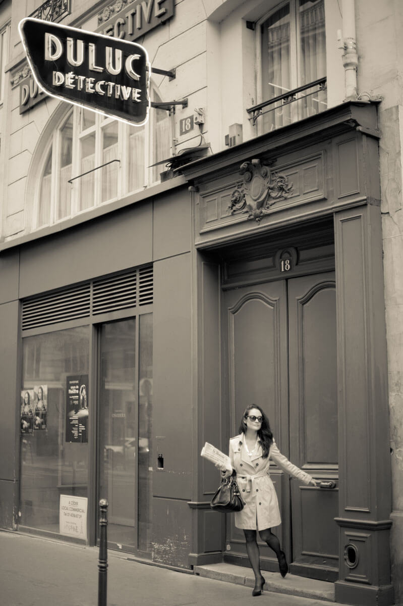 Film Noir crime dramas inspired this retro detective photo shoot. The story begins at Duluc Détective, the oldest private detective agency in Paris, and takes us on an adventure through the 1st arrondissement to solve a Parisian mystery. The last photograph, my signature red umbrella photo that started a trend, was featured on the cover of Le Style magazine.