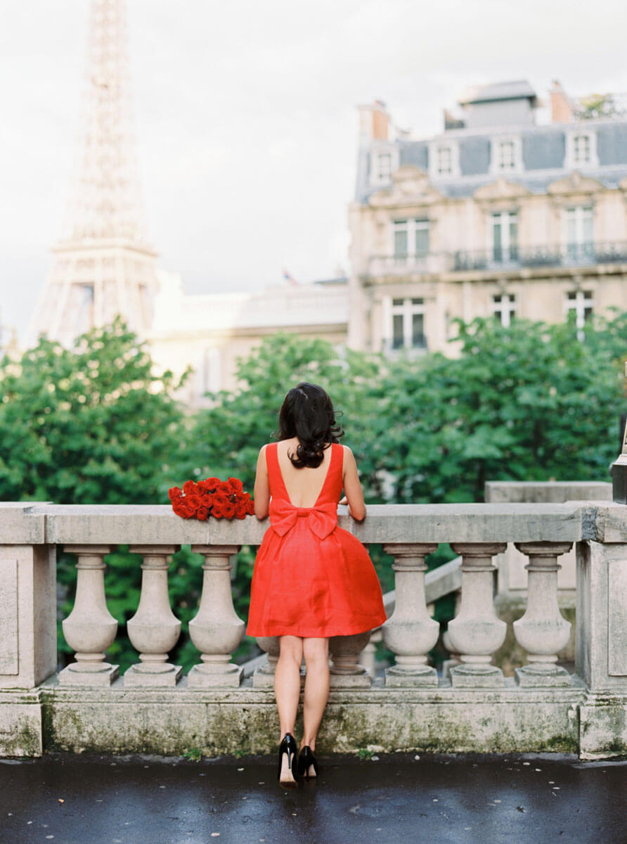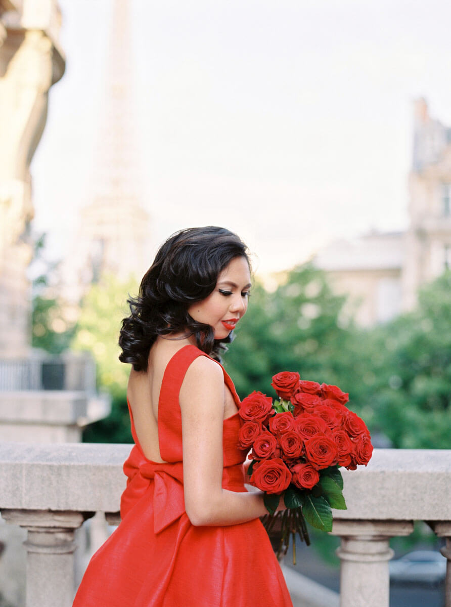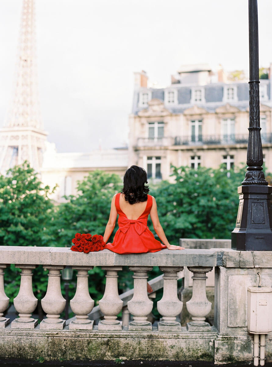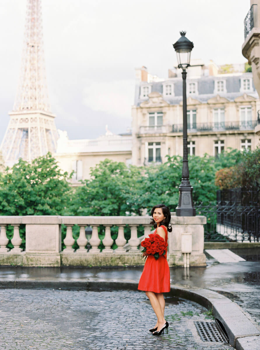 The bride, Jaimee Rose, planned every detail of this elegant wedding to perfection. Jaimee wore a vintage Dior coat and a black wedding dress. The ceremony took place under the Fall foliage at the Jardin des Tuileries and the groom arranged to have an accordionist play La Vie en Rose for their first dance. Their adorable cake and umbrella mirrored the Buren Columns at the Palais Royal. The couple hired a driver with a vintage Citroen Traction Avant to drive us around Paris for their portraits. We arrived at the Eiffel Tower just in time to see her sparkle. Since this unforgettable elopement, I’ve had the pleasure of photographing their anniversary in Paris, family portraits in Southern California, and an epic Paris girls trip photo shoot with all of the incredible women and girls in Jaimee’s family, 3 generations.