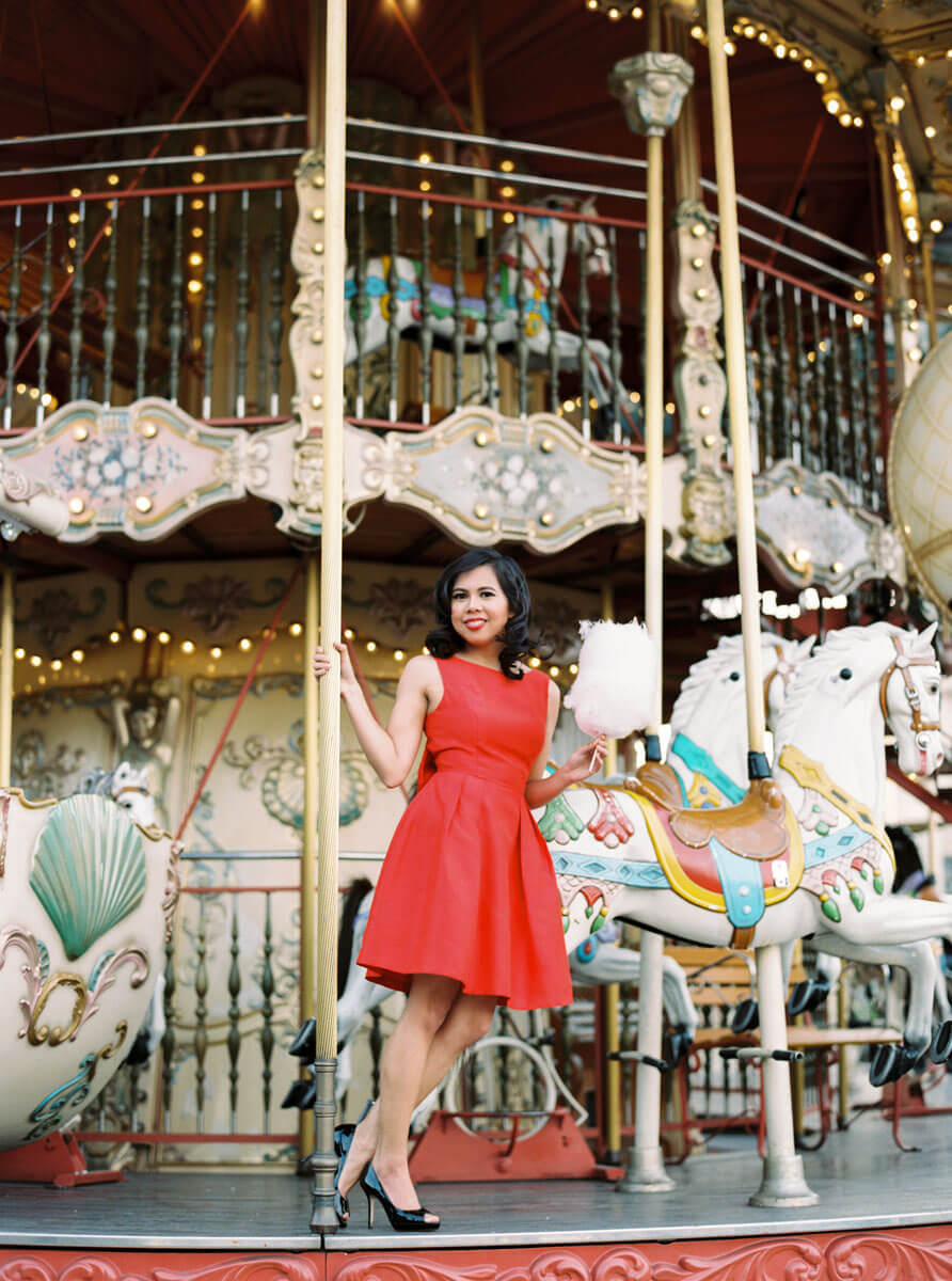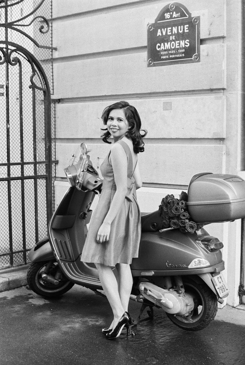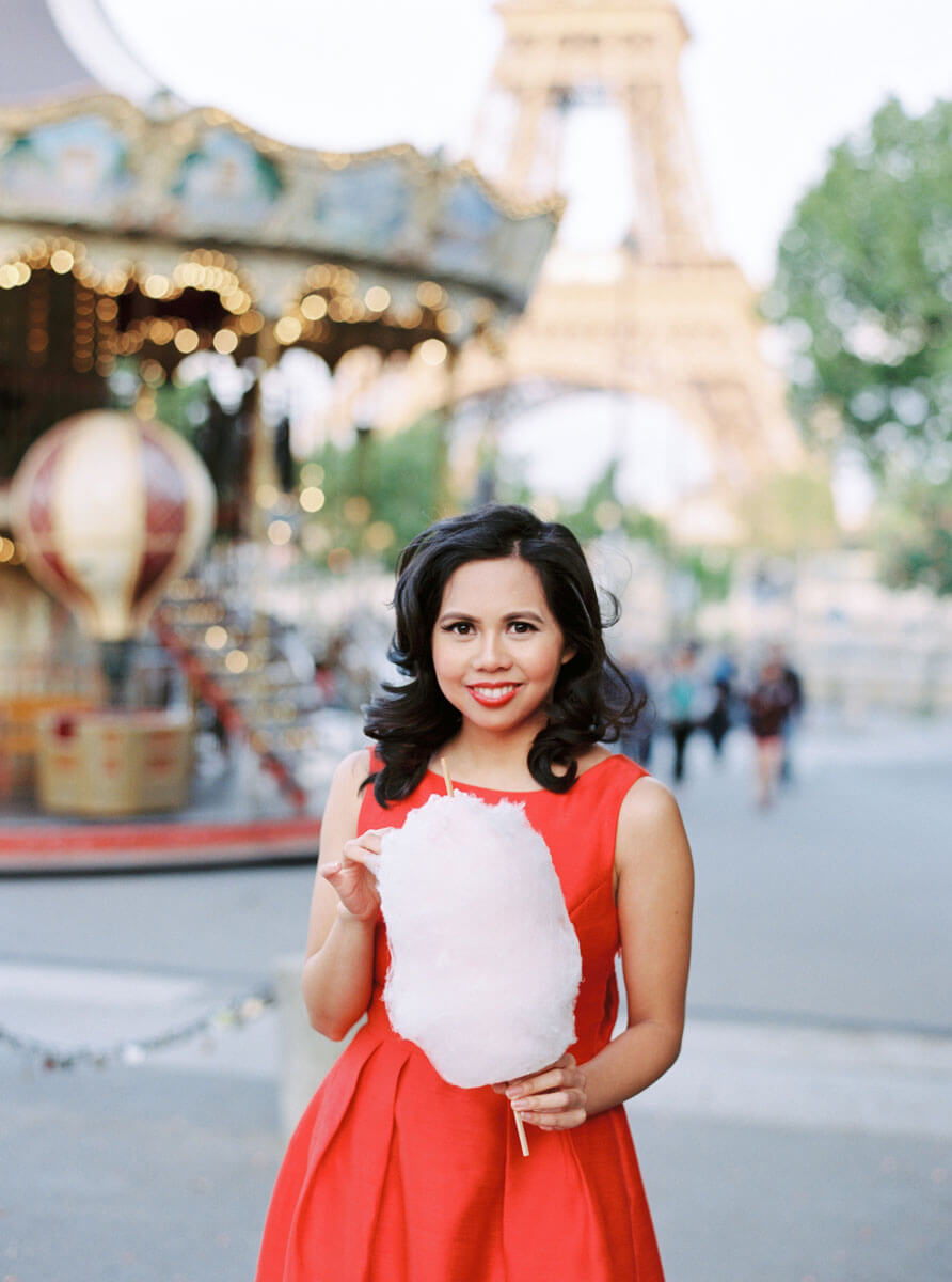 Celebrate yourself with a portrait session in the city of your dreams. For this custom photo shoot, we picked a spot with charming view of the Eiffel Tower, a typical Parisian sidewalk cafe terrace, and a carousel, where this lovely woman indulged in cotton candy. I enjoy setting a mood with my clients using the city around us, so of course we had to utilise the Vespa, the perfect Parisian prop.