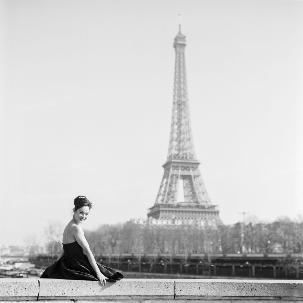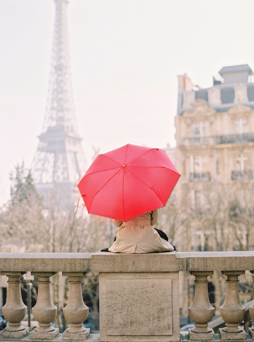 The bride, Jaimee Rose, planned every detail of this elegant wedding to perfection. Jaimee wore a vintage Dior coat and a black wedding dress. The ceremony took place under the Fall foliage at the Jardin des Tuileries and the groom arranged to have an accordionist play La Vie en Rose for their first dance. Their adorable cake and umbrella mirrored the Buren Columns at the Palais Royal. The couple hired a driver with a vintage Citroen Traction Avant to drive us around Paris for their portraits. We arrived at the Eiffel Tower just in time to see her sparkle. Since this unforgettable elopement, I’ve had the pleasure of photographing their anniversary in Paris, family portraits in Southern California, and an epic Paris girls trip photo shoot with all of the incredible women and girls in Jaimee’s family, 3 generations.