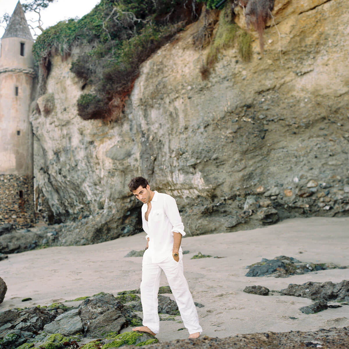 Victoria Beach is a storybook setting, with it’s romantic tower, for this portrait session. After a quick outfit change, we finished at a local Laguna Beach café for a fun vibe. Captured entirely on film with a vintage Rolleiflex and a 35mm camera.