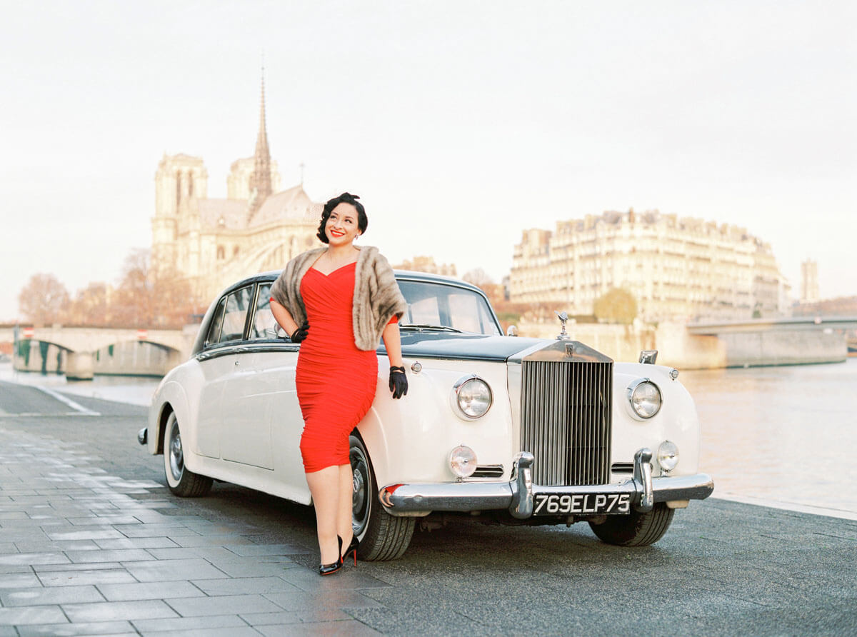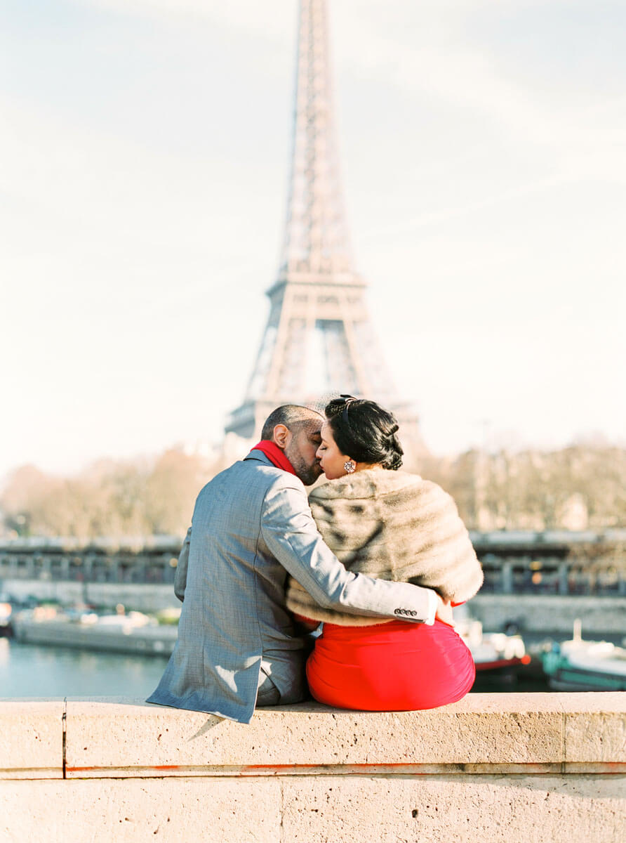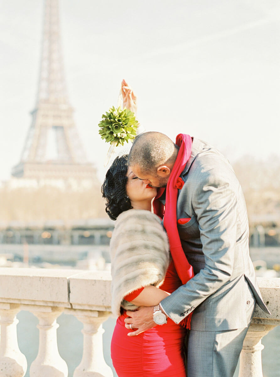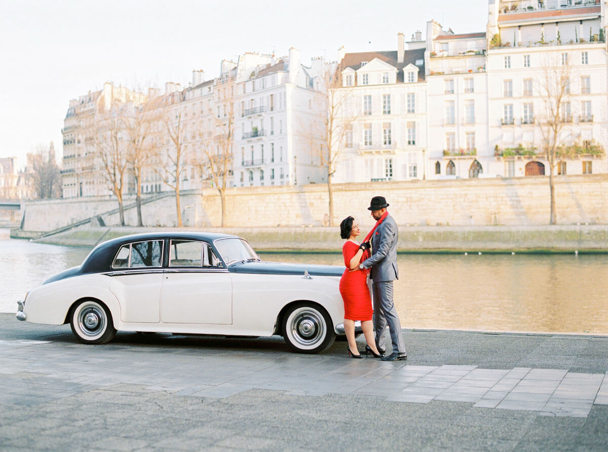 Beautiful details for this lovely couple’s romantic Paris photo shoot – a vintage Rolls Royce, a kiss under the mistletoe, and Christian Louboutin heels. Locations included La Seine, The Eiffel Tower and Place Colette. Shot entirely on medium format film.