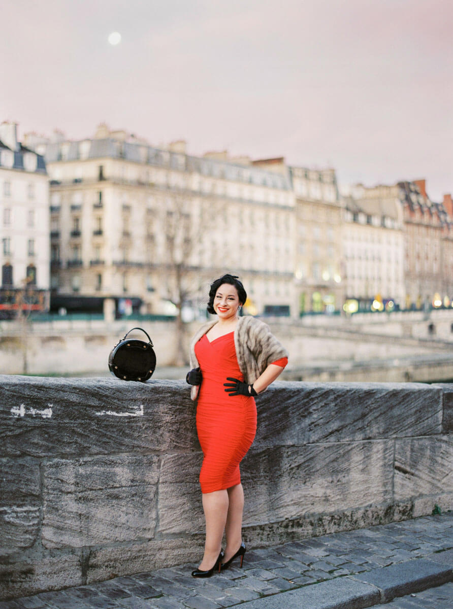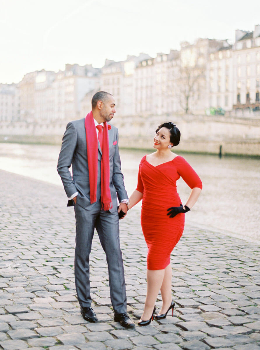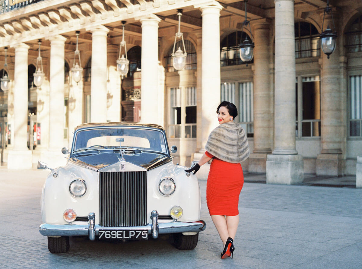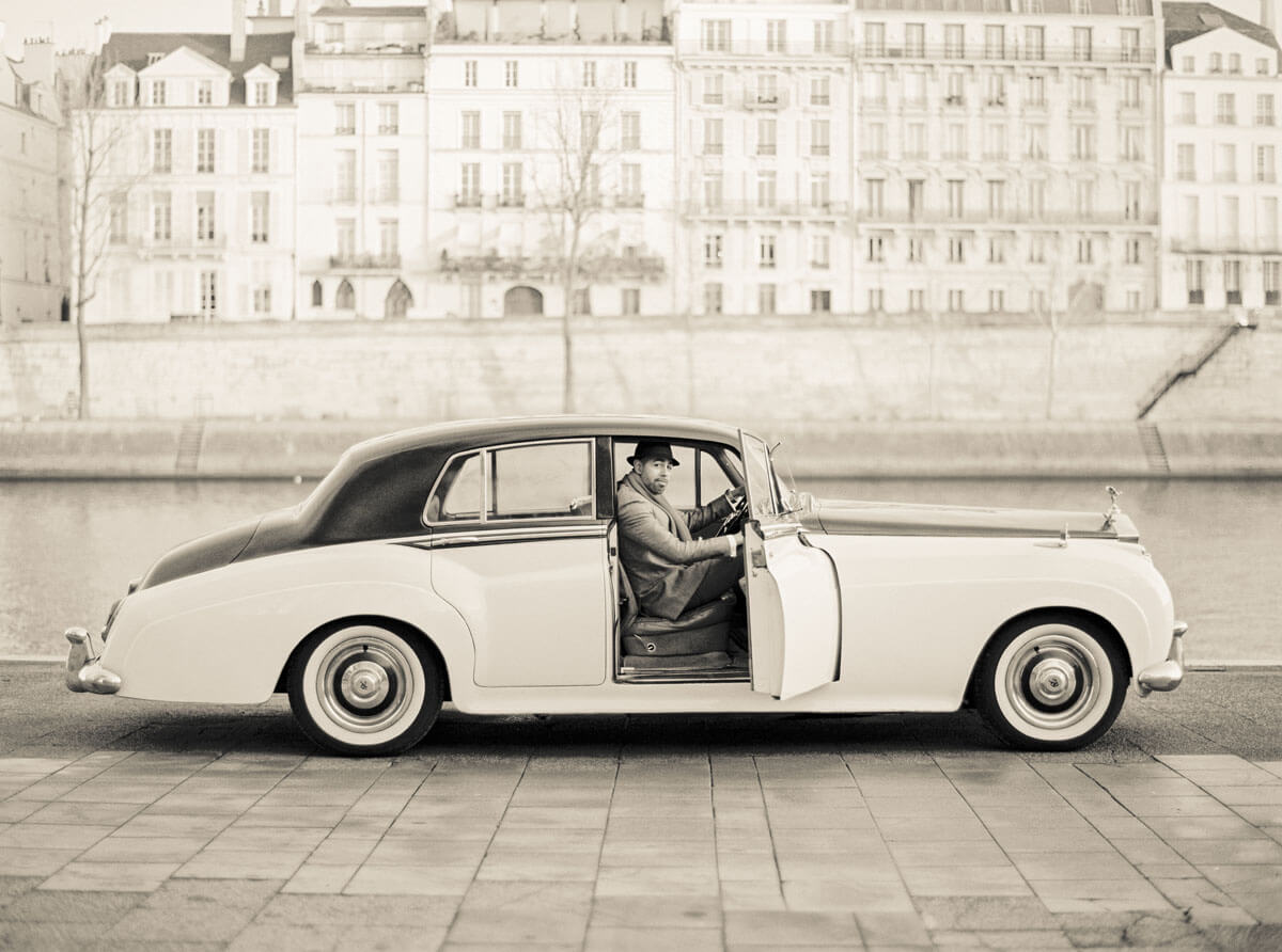 Beautiful details for this lovely couple’s romantic Paris photo shoot – a vintage Rolls Royce, a kiss under the mistletoe, and Christian Louboutin heels. Locations included La Seine, The Eiffel Tower and Place Colette. Shot entirely on medium format film.