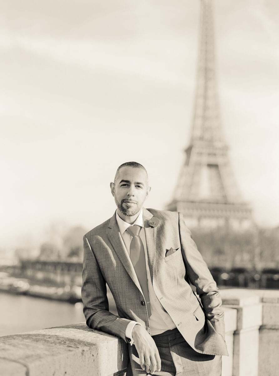 The bride, Jaimee Rose, planned every detail of this elegant wedding to perfection. Jaimee wore a vintage Dior coat and a black wedding dress. The ceremony took place under the Fall foliage at the Jardin des Tuileries and the groom arranged to have an accordionist play La Vie en Rose for their first dance. Their adorable cake and umbrella mirrored the Buren Columns at the Palais Royal. The couple hired a driver with a vintage Citroen Traction Avant to drive us around Paris for their portraits. We arrived at the Eiffel Tower just in time to see her sparkle. Since this unforgettable elopement, I’ve had the pleasure of photographing their anniversary in Paris, family portraits in Southern California, and an epic Paris girls trip photo shoot with all of the incredible women and girls in Jaimee’s family, 3 generations.