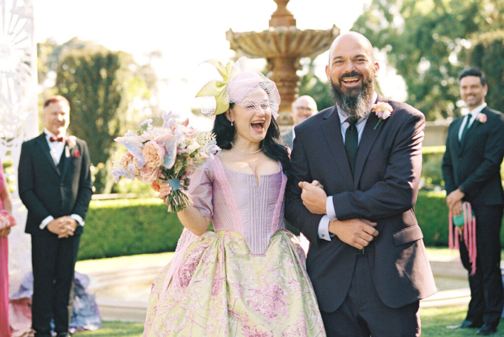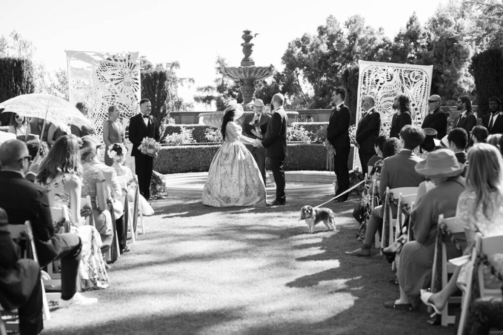 This Beverly Hills wedding has tons of unique DIY elements, an epic Marie Antoinette style dress, and 2 adorable King Charles Spaniels. The bride is an artist and she designed/made the beautiful fabrics used throughout the wedding, as well as all of the whimsical decor, which perfectly complimented the beautiful architecture and landscape of Greystone Mansion and Gardens.